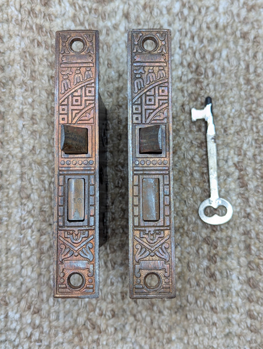 Pair Of Antique P & F Corbin "Ceylon" Mortise Locks Door Hardware W/Key Circa 1895