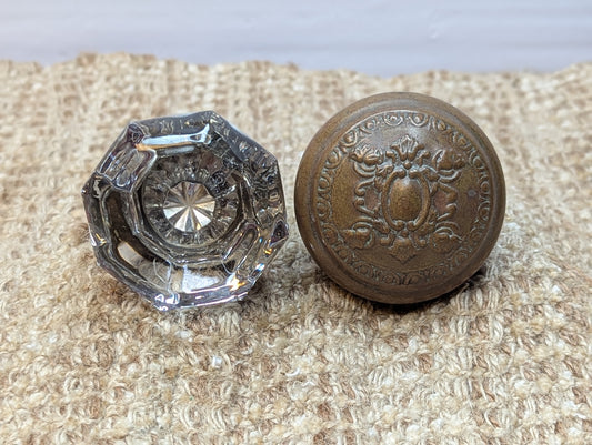 2 1/4" Antique Reading "Creston" Brass Door Knob Circa 1900 and Octagon Glass Door Knob