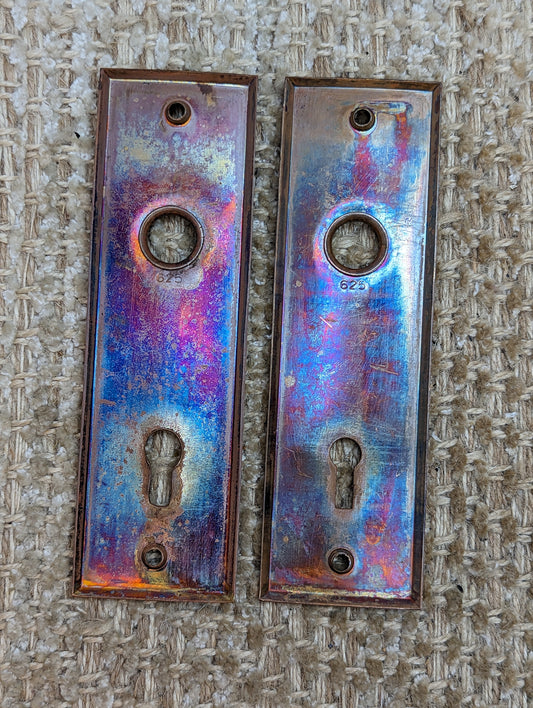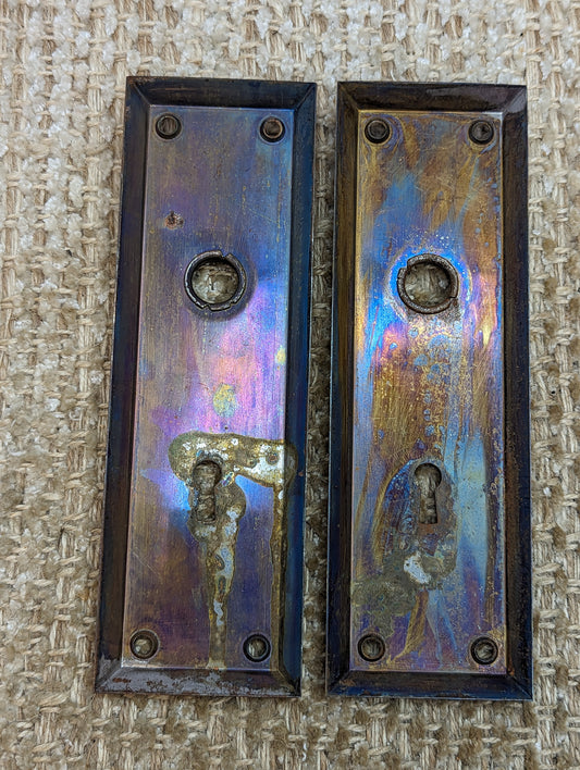 2 1/4" x 7" Pair Of Antique Stamped Steel Door Knob Plate Hardware
